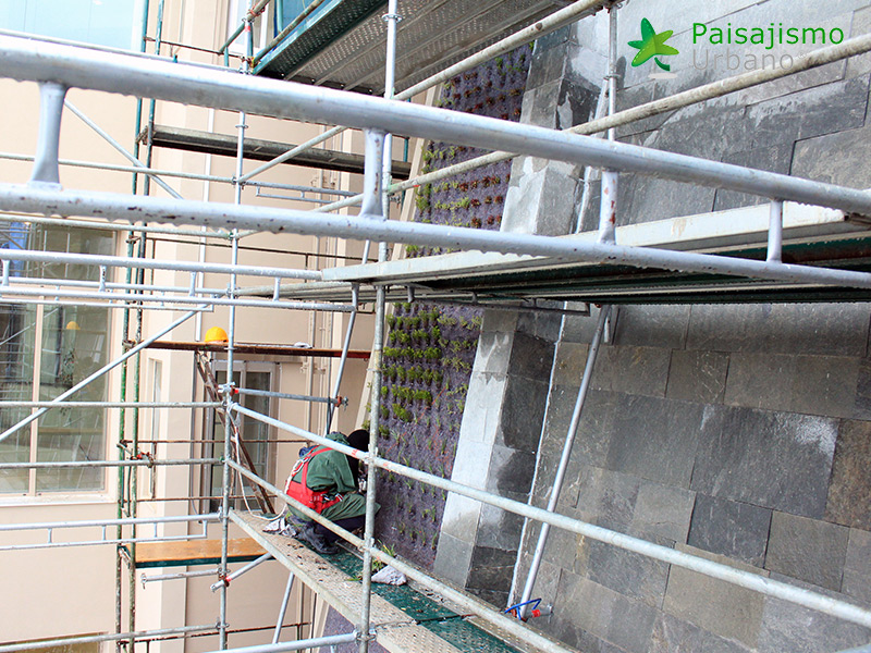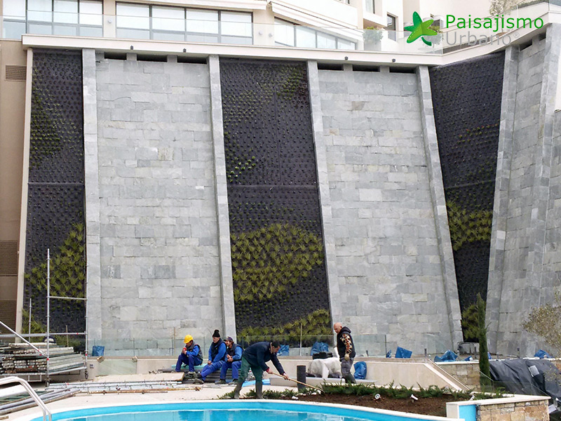 El ecosistema vertical está compuesto por tres jardines verticales de casi 13 metros de altura, separados entre si por dos cascadas de agua que vierten su contenido en un estanque. La ejecución se realizó en un tiempo record, puesto que al estar fijada la fecha de inauguración del complejo, los jardines tuvieron que estar terminados en dos semanas.