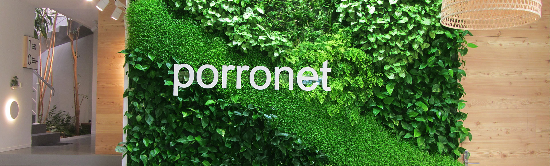 Este proyecto, realizado para la empresa de calzado Porronet está compuesto por dos jardines verticales de diferentes tamaños, uno de 13,65 m2 y otro de 7,56 m2, lo que suma un total de 21,21 m2. Para la realización de estos muros vegetales se han utilizado más de 700 plantas pertenecientes a diez especies y cuatro familias distintas.